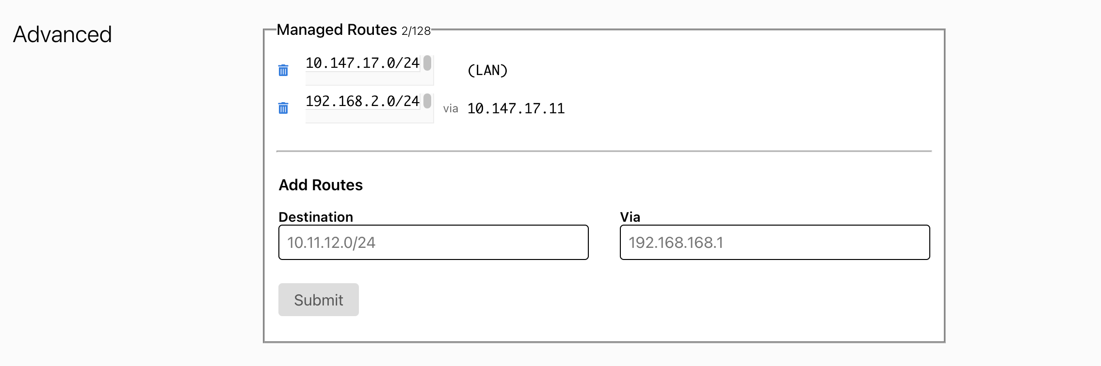 destination填写你的局域网网段例如192.168.2.0/24 ,via输入分配给你的虚拟局域网地址例如10.147.17.11